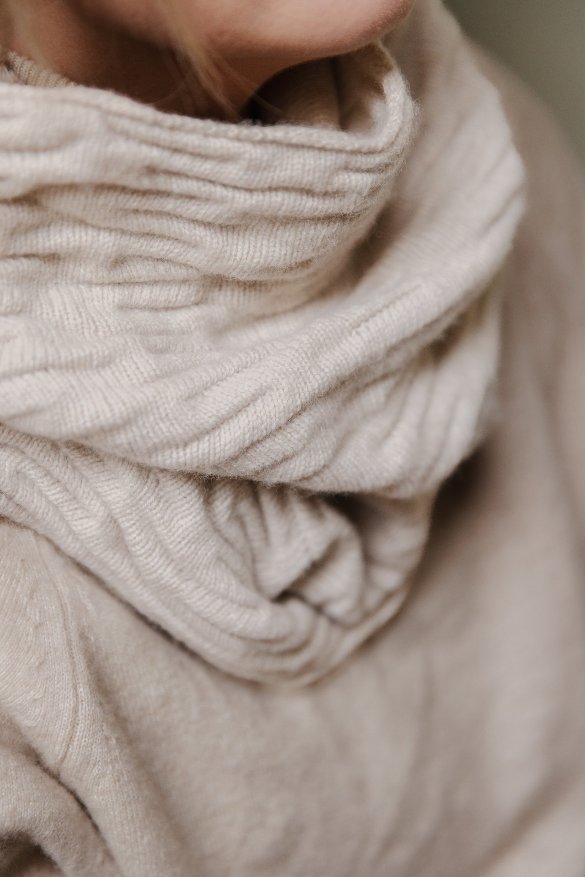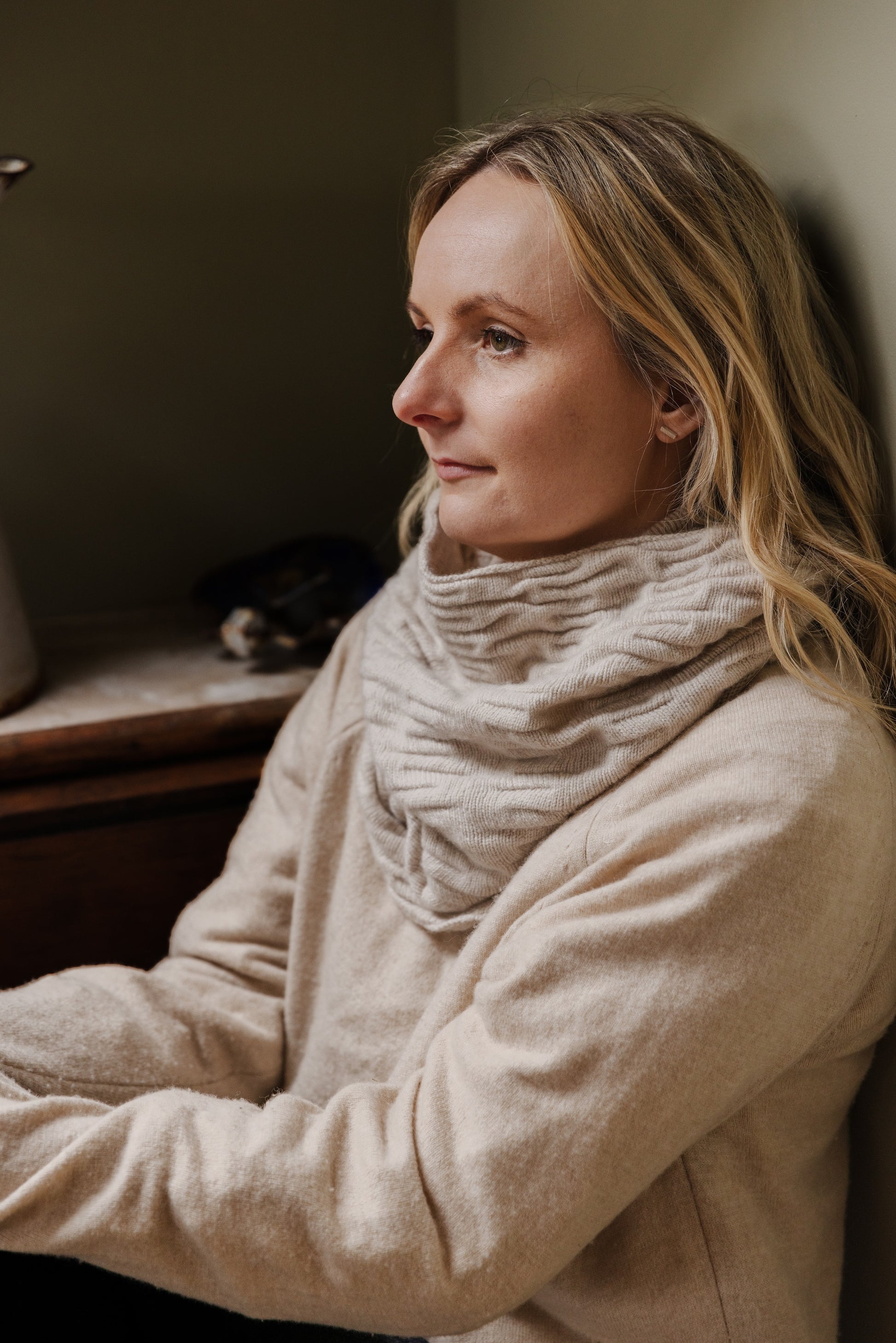 The Cowl Scarf is a further study of texture and form. The technique creates long lines of colour depth and shadows that mirror that of nature. The scarf effortlessly loops over the head is versatile in shape. The textured pockets break a cold wind even though this scarf is light and perfect for any season.