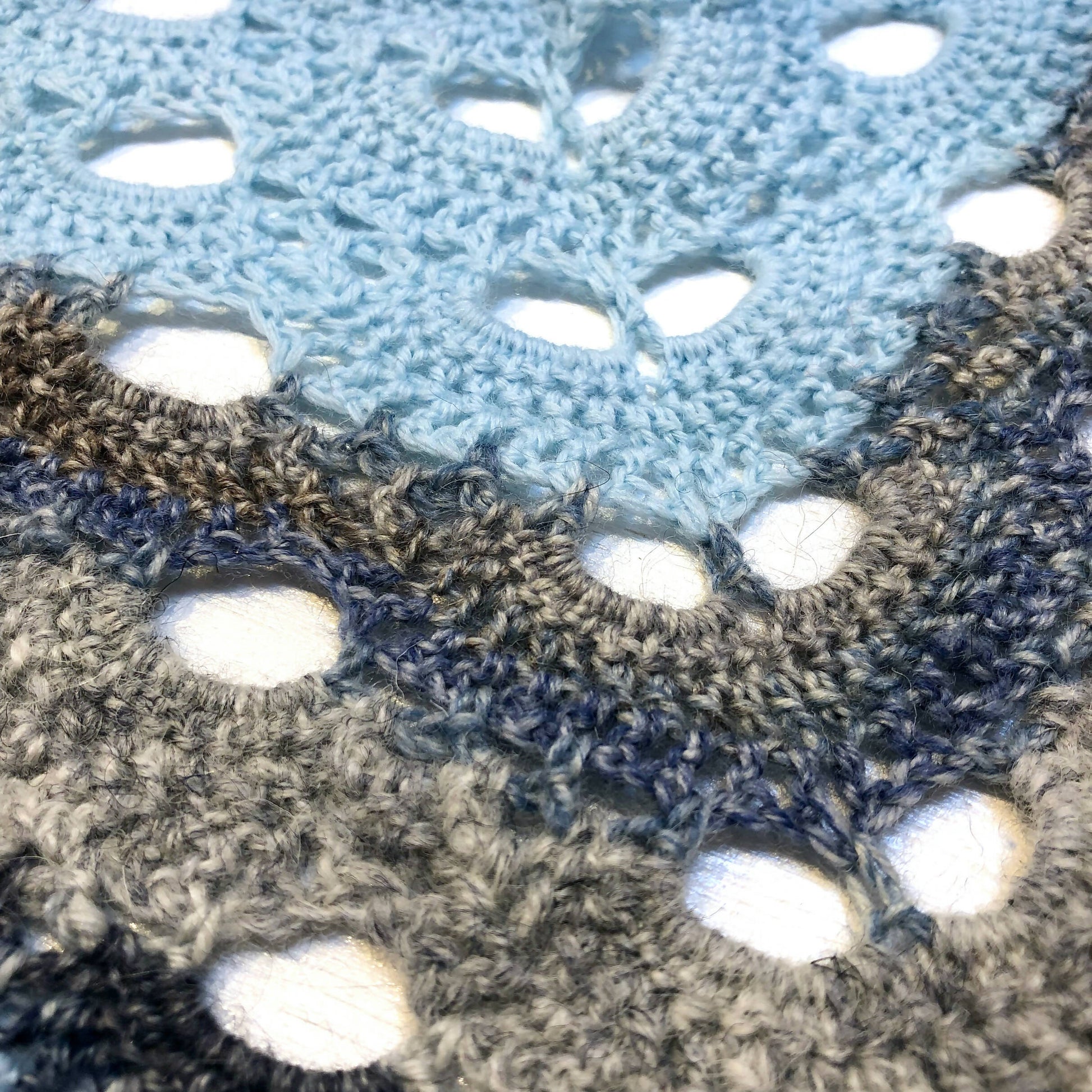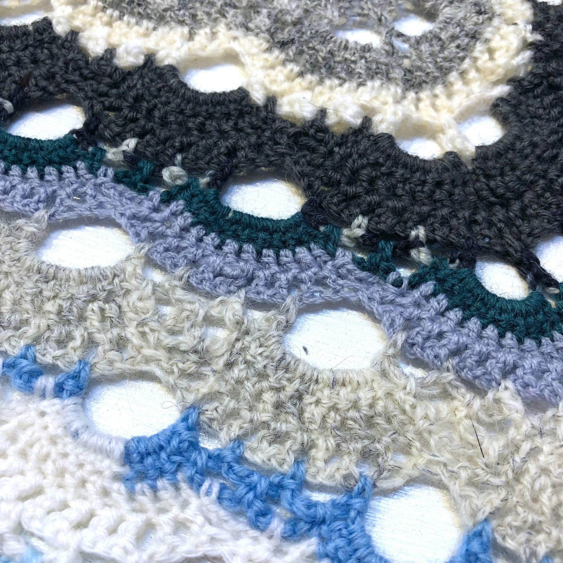 A mixture of blues, greys and whites. Perfect for wearing as a statement scarf or slung around shoulders to keep the chill off. This item is one of a kind... you'll never see anyone else wearing it!