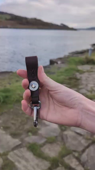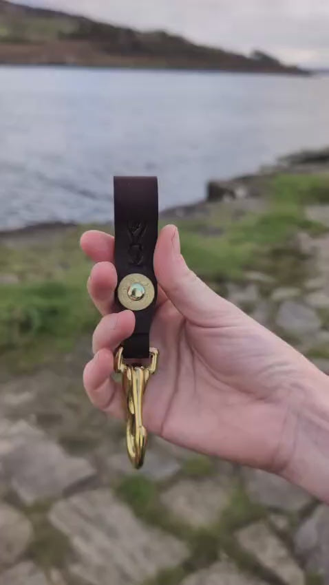Handmade on the Morvern peninsula overlooking the Sound of Mull, each piece features a spent 20 bore shotgun cartridge, riveted into premium 4mm leather, and finished with a durable solid brass snap hook. Crafted from upcycled materials, every lanyard carries its own unique story, with variations in available cartridges, making each one truly one-of-a-kind.